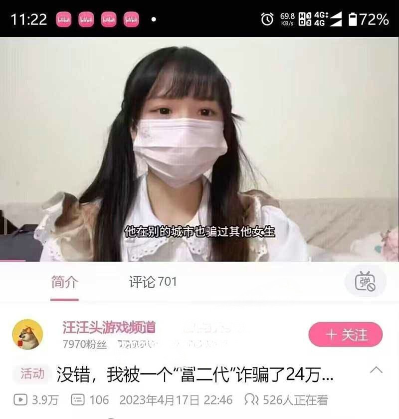 近日,B站女主播汪汪头游戏频道发布一条视频,内容讲述自己被假冒富二代的马鑫淼骗财骗色的事件: 本人于去年 12 月份在网上认识了马鑫淼,认识初期营造富二代人设,营造自己名下两辆小车(一辆玛莎拉蒂,一辆特斯拉),并且营造自己在岳阳、深圳、东莞有三套房产,然后以关注很久等名义希望与其进行恋爱,后被哄骗至长沙,在长沙居住期间,多次以其父离世,遗产被法院冻结需要资金打点法院那边为由诱骗我多次在各平台借贷然后转账至他本人名下,最后金额达到 24w+