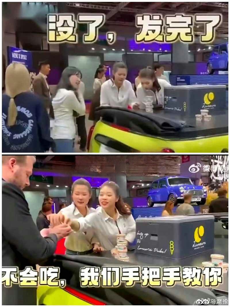 此事件一经发酵,就有主播来展台直播,有主播现场向国人发放免费冰激淋,却被保安拉扯制止