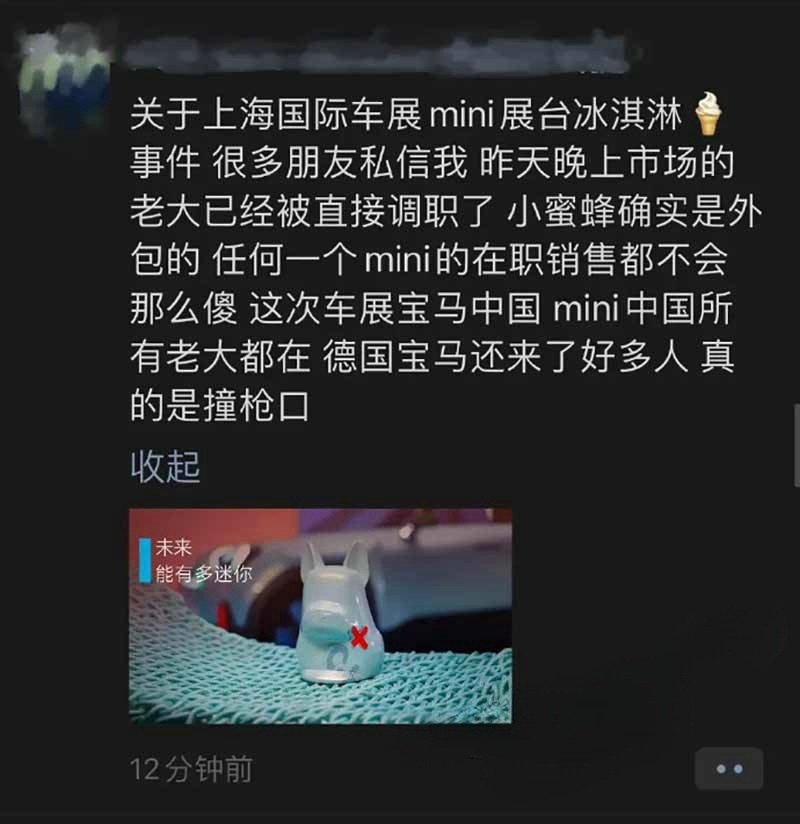 4月20日下午,在上海车展现场目睹一名女主播与宝马 MINI 展台方发生激烈争执,后被强行带离现场。早先的直播画面显示,女主播与 MINI 展台保安沟通称被展台工作人员推了一下,要求该工作人员道歉,保安提到 “现在展商禁止直播”“把人带下去好好聊一下”。后保安打开黑伞、拉开黑布,叫来了展馆多名保安,将女主播强行带离现场。现场十分混乱,女主播的手机和稳定器也摔落在地。